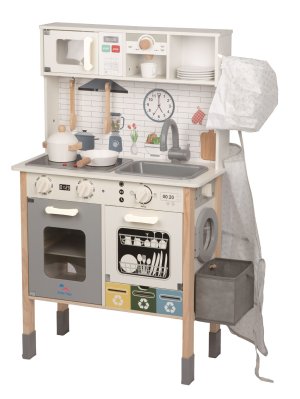 Rozměry balení: 67,6x52x14,5 cm Rozměry kuchyňky: 61x96x30 cm Věk: 3+ Výška pracovní desky: 60 cm Materiál: FSC® dřevo, plast, látka Baterie: 2xAAA, 2xAA baterie – nejsou součástí balení Obsahuje 13 …