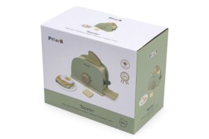 Dřevěný toustovač. Balení obsahuje toustovač, plátek sýra, toast, vajíčko a talířek.