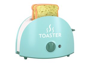 Plastový Toaster pro malou hospodyňku obsahující dva toasty.