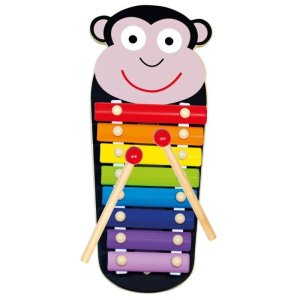 Dětský xylofon s motivem opičky. 3-dílná sada s 8 kovovými zvukovými pláty, které nabízejí hraní v plném rozsahu.