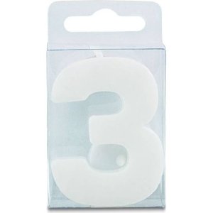 Svíčka ve tvaru číslice 3, výška 4 centimetry, bílá.