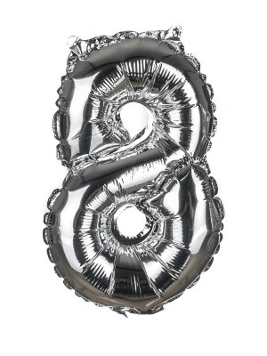 Balónek nafukovací fóliový číslo 8, je vysoký cca 30 cm, barevný mix: zlatá a stříbrná barva.