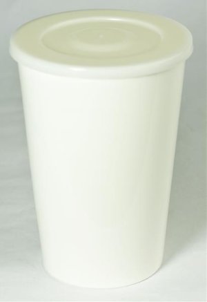 Neprůhledný, bílý, plastový kelímek s víčkem.