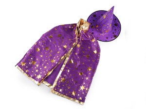 Dětský čarodějnický karnevalový kostým se skládá z klobouku a pláště.