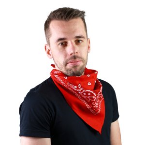 Stylový šátek v červené barvě s kovbojským motivem má rozměry 53 x 53 cm.