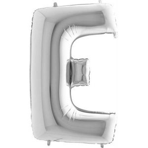 Stříbrný balónek písmeno E. Balónek je vyrobený z pevné fólie.