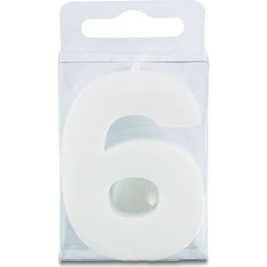 Svíčka ve tvaru číslice 6, výška 4 centimetry, bílá.