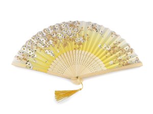 Textilní vějíř zdobí potisk motýlů, který je doplněný třpytivými glitry.