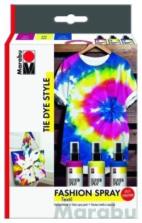 Bullseye, spirála nebo pruhy? Super snadné s módním sprejem Marabu.Tkaninu důkladně navlhčete, přeložte a svázejte gumičkami, nastříkejte!