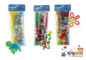 Obsahuje pestrou směs výtvarných komponentů, se kterými si děti snadno vytvoří zvířátka, květiny, postavičky nebo dekorace.