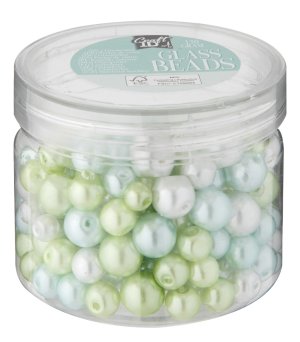 Skleněné korálky baleny v praktické průhledné pevné plastové krabičce s víčkem, celkem 130 gramů korálků různých velikostí ve 4 odstínech zelené barvy