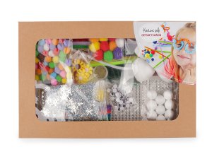 10 hvězd z papírové hmoty, 5 mini lahviček, 2 lahvičky s barvou, lahvička s inkoustem ve spreji, 6 stránek s inspirativních vzkazů, flitry a třpytivý prášek, papírové konfety, lepidlo, 40 korálků, 5 …