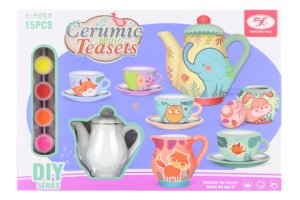 Vybarvovací čajový set obsahuje 4 šáleky s podšálky, konvičku, mlékovku, cukřenku, 6 barev a štětec.