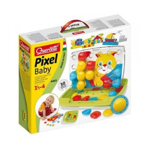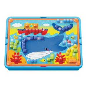 Mozaika pro mladší děti. Obsahuje 48 knoflíků O 3 cm v celkem 6 barvách, 8 vzorových oboustranných karet a transparentní desku s otvory v inovovaném designu s rukojetí pro snadné přenášení.