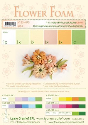 Sada speciálních pěnovek Foamiran, formát A4 (21x29,7cm), tloušťka 0,8mm, 6 barev: bílá, světle žlutá, světle růžová, světle fialová, světle modrá, pastelově zelená.