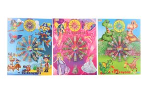 Omalovánky s motivem pirátů, dinosarů a princezen.