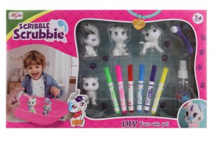 Sada malování zvířátek. Balení obsahuje 4 zvířátka, 6 barviček, vaničku, kartáček a lahvičku s rozprašovačem.