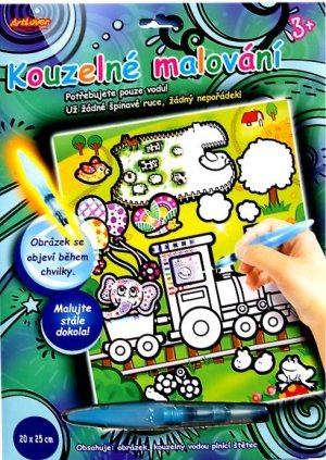 Kouzelné omalovánky disponují čtyřmi obrázky. Štětec se naplní vodou a po rozetření vody na bílou plochu obrázky získají barvu.