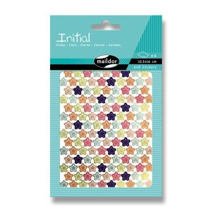 Samolepky Maildor Inital s různými barvami a velikostmi hvězd.