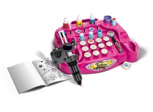 Tetovací studio obsahuje stříkací tetovací pero, šablony, třpytky a 3 barevné fixy.