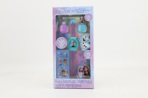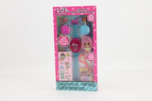 Kosmetická sada se se dvěma laky na nehty, rtěnkou v hodinkách, přívěskem a samolepkami.