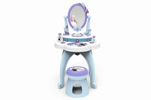 Robustní toaletní stolek se stoličkou a s velkým otočným zrcadlem je navržen v oblíbených barvách ledové královny Elsy a její sestry Anny.