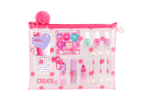 Sada make up v taštičce obsahuje – 3 laky na nehty, 3 aplikátory, lesk na rty, balzám na rty a samolepky na nehty.