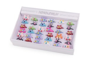 Mix dětských kovových prstýnků s motivy zábavných koček a příšerek je zabalený v papírové kazetě, která má průhledné plastové víko.