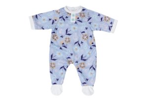 Rozkošný overal v modré barvě s jemným květinovým vzorem pro roztomilý a útulný vzhled.