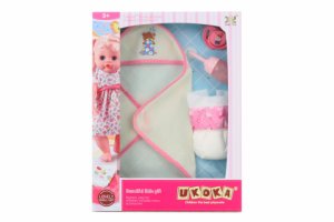 Doplňky pro panenku 30 cm. Balení obsahuje látkovou zavinovačku, plastový dudlík, plastovou lahvičku a plenku.