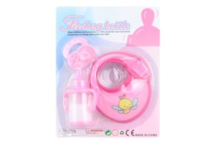 Sada doplňků pro panenku obsahuje lahvičku, dudlík a bryndáček.