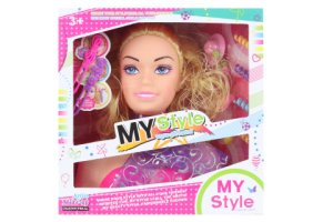 Česací hlava s doplňky. Obsahuje 2 hřebeny, gumičky, sponky a další doplňky.