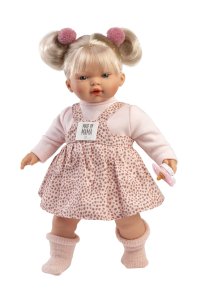 Mluvící a plačící panenka (po vyjmutí pojistky ihned funkční) s měkkým látkovým tělem a s vlásky po celé hlavě.