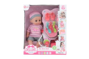 Miminko s doplňky. Panenka po vložení baterií vydává zvuky a čůrá.