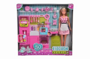 Panenka Steffi s kuchyní s bohatým příslušenstvím, lednicí, mikrovlnkou a troubou.