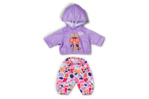 Oblečení velikosti 43 cm. Sada obsahuje fialovou mikinu a barvné kalhoty.