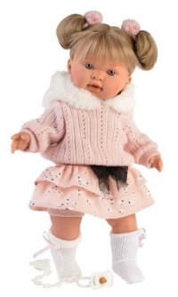Mluvící panenka s měkkým látkovým tělem a s vlásky po celé hlavě. Po vytažení dudlíku z úst začne panenka říkat „mama“, „papa“ a vydávat reálný zvuk plačícího miminka.