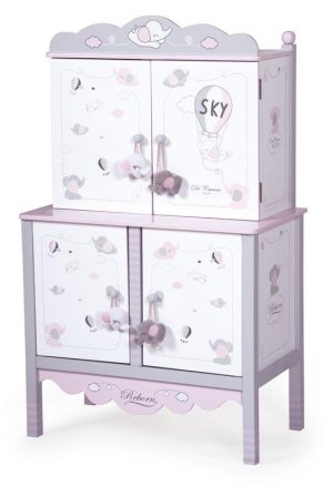 DeCuevas 54835 Dřevěná šatní skříň pro panenky s hracím centrem a doplňky SKY 2020 je z inovované kolekce SKY 2020, která má letos ve svém znaku roztomilé slůně.