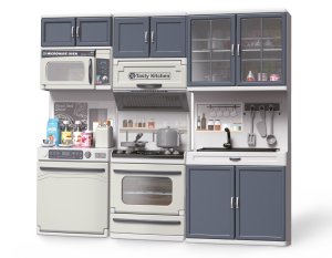 Glorie kuchyňský set obsahuje kuchyňskou linku (24 x 29,5 x 7 cm) s nádobím a vestavěnou troubou, samostatný dřez s myčkou (17 x 14 x 7,5 cm) a lednici (11 x 25,5 x 5 cm).