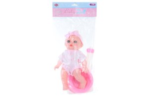Plastové čůrající miminko. Balení obsahuje nočník, lahvičku a plenku.