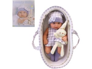 Panenka s králíčkem, fialové oblečky, výška panenky 33 cm, vyrobena z bezpečného plastu, vhodné od 3 let, balení window box.