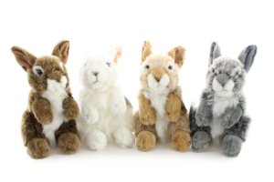Plyšový sedící zajíček o velikosti cca 20 x 11 x 10 cm.