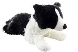 Plyšový pes Boredr kolie s postrojem ležící o rozměru cca 70 x 26 x 20 cm.