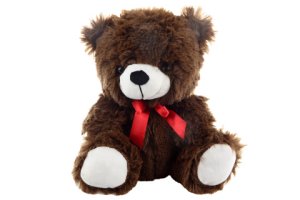 Plyšový medvěd s mašlí o rozměru cca 20 x 25 x 15 cm.