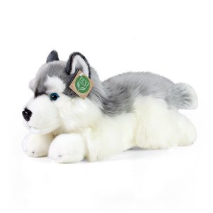 Plyšový husky o rozměrech cca 43 x 23 x 15 cm.