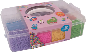 Praktická sada zažehlovacích korálků a korálků s písmeny uložená v plastovém organizéru.