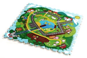 Zábavné hraní na vesnici! Pěnové podlahové puzzle bez vyjímatelných částí s barevnými zvířátky, domečky a silnicemi je ideální pro rozvoj dětské fantazie.