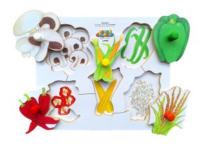 Just Jigsaws 153 Loupeme a krájíme plodiny 4 - dřevěné deskové puzzle 6 dílů představuje dřevěnou skládačku s kolíčky pro snadný úchop, která dětem krásně znázorňuje, jak vypadá zelenina, houby, kukuřice …