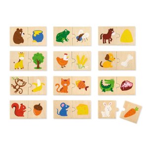 Tato skládačka se skládá ze dvou dílků, batole si každé zvíře spojí s tím, co rádo jí.