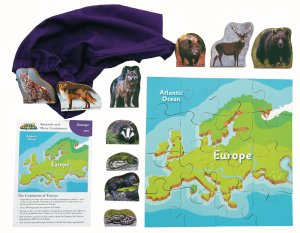 Just Jigsaws 775 Evropa a její zvířata - dřevěné puzzle 16 dílů a 10 zvířat je vzdělávací sada, jejímž smyslem je seznámit děti s jednotlivými kontinenty a jejich faunou.